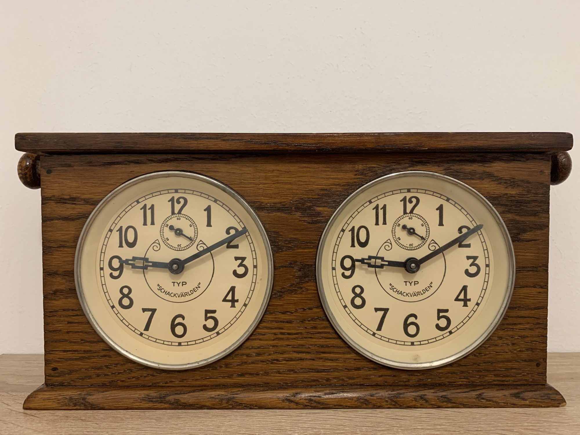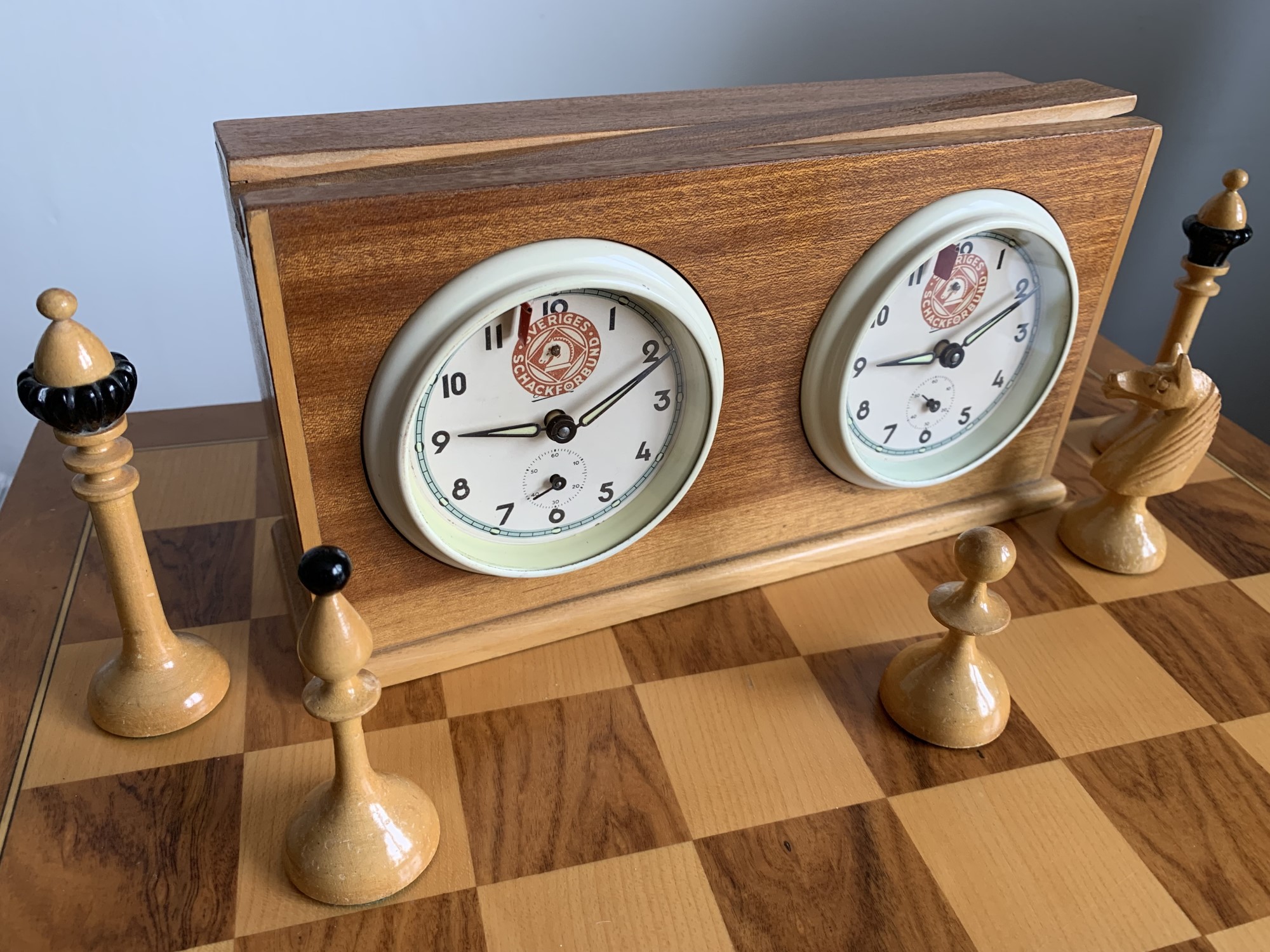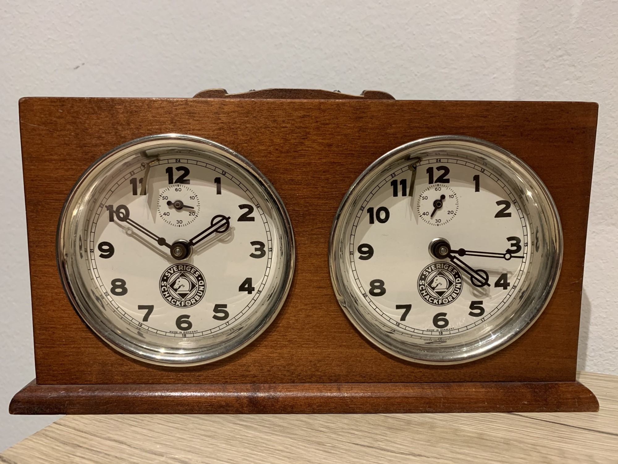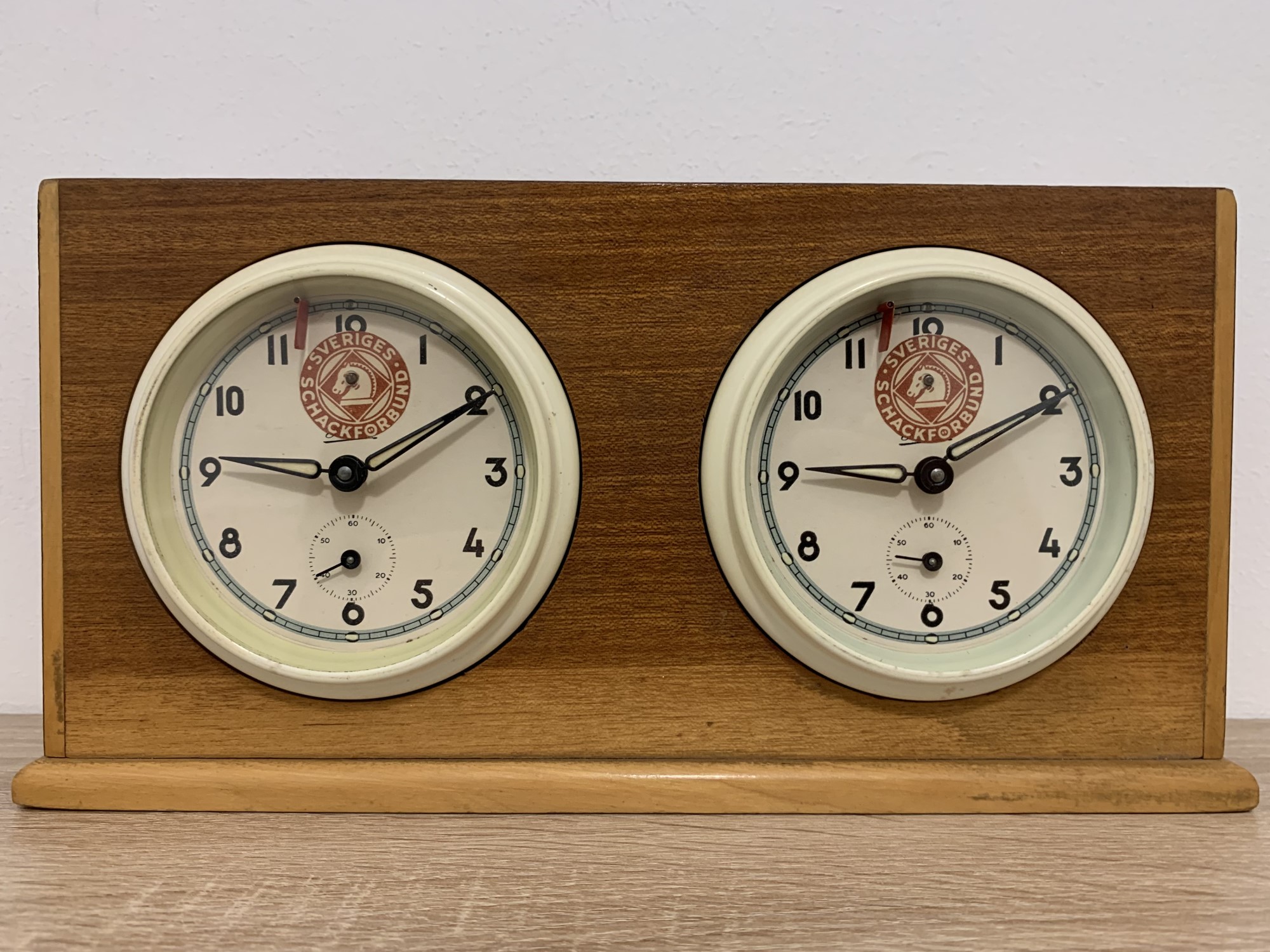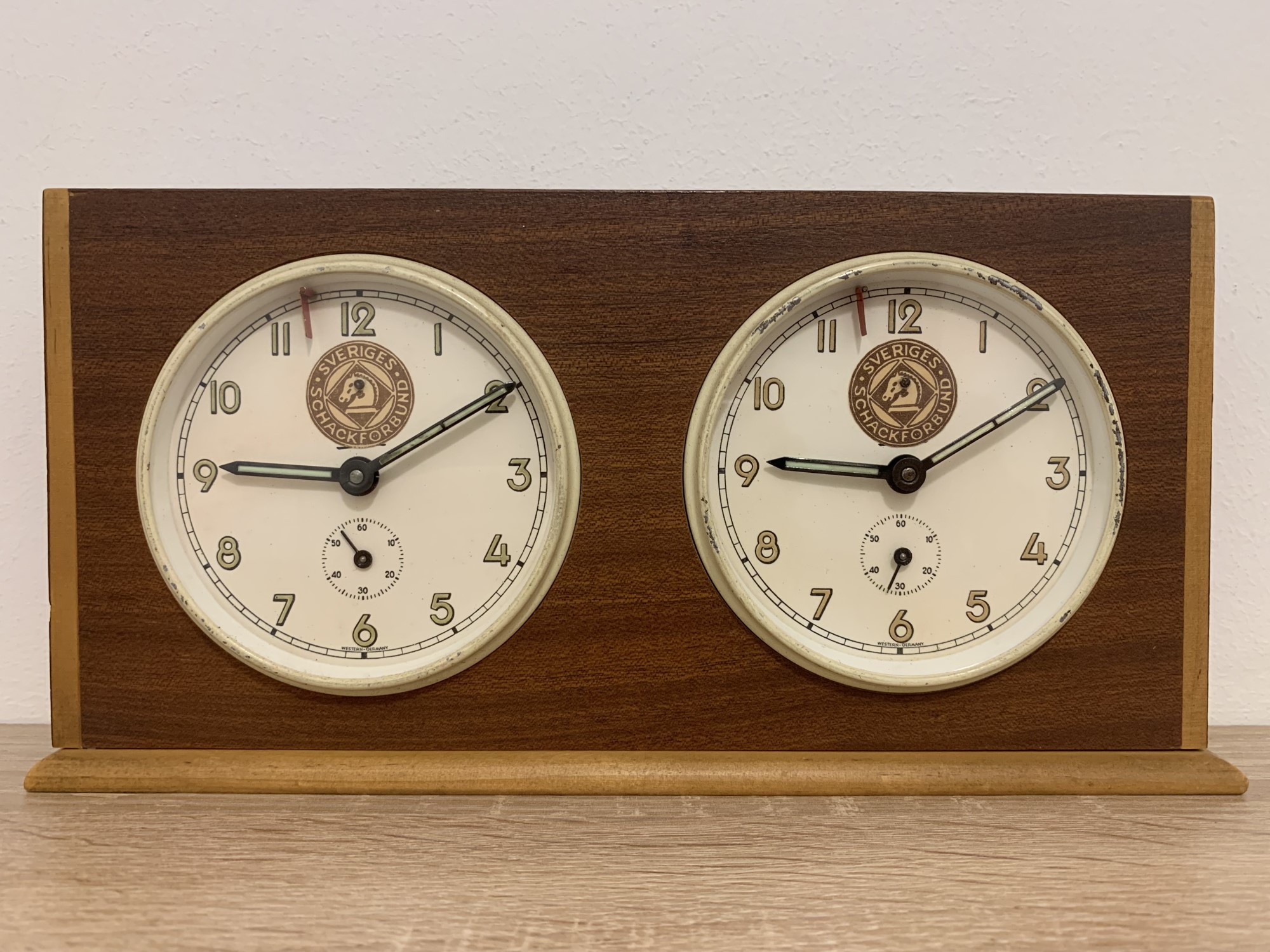 Classical 'Swedish Federation' chess clock. Both clock movements as well as faces are totally identical to the Koopmans from mid 1940th to the late 1950th. Surprisingly there are not a lot of photo evidences of the usage of this type of clock on tournaments (at least, in comparison to other Swedish); also, all the available photos refer to the second part of 1950th and 60th. Photo: Boerje Jansson (1972). |