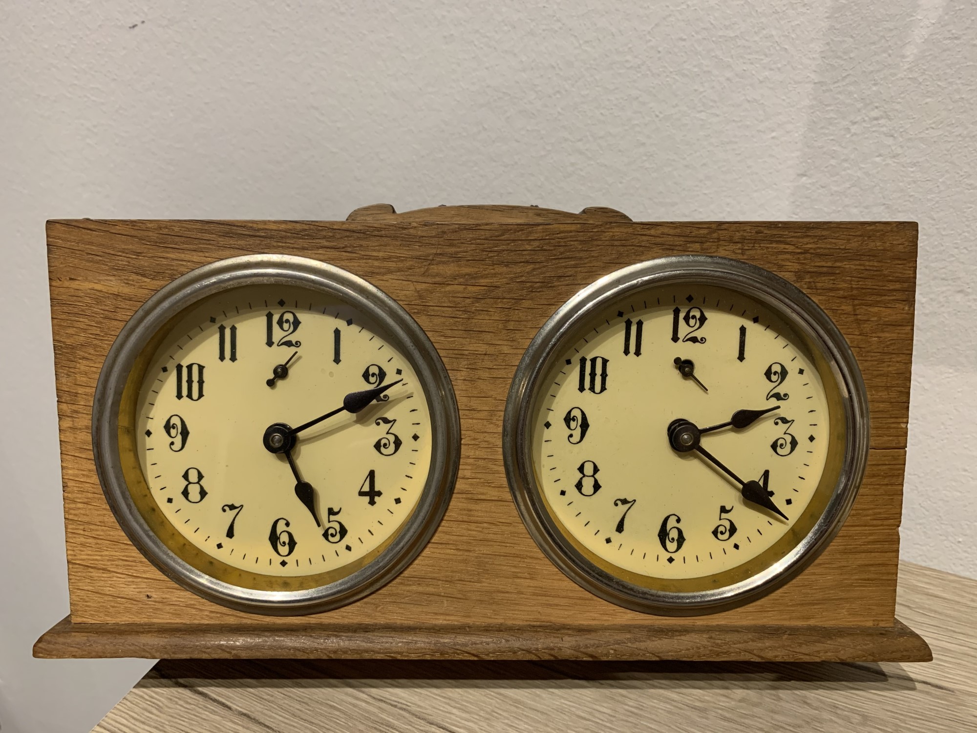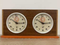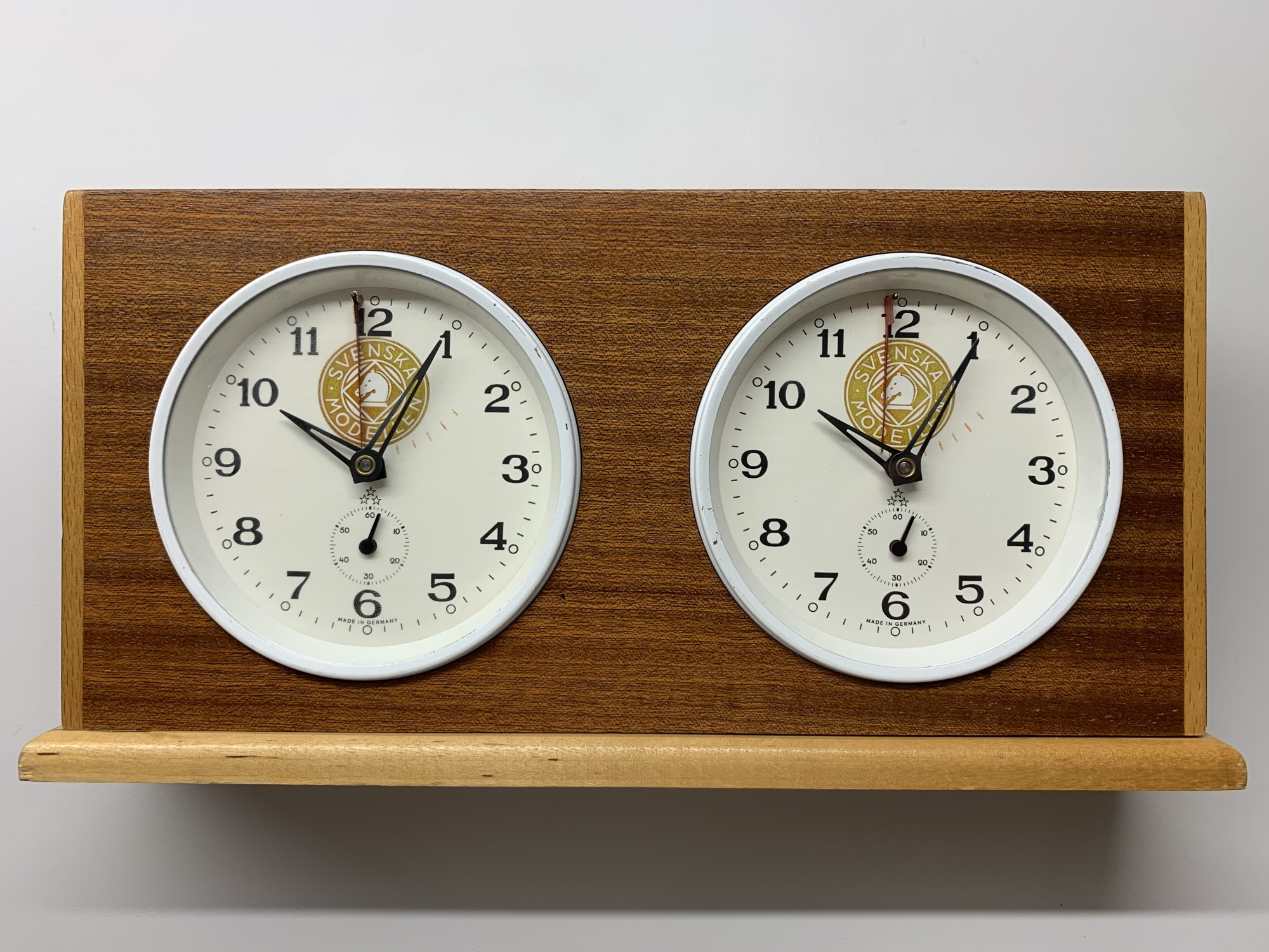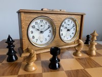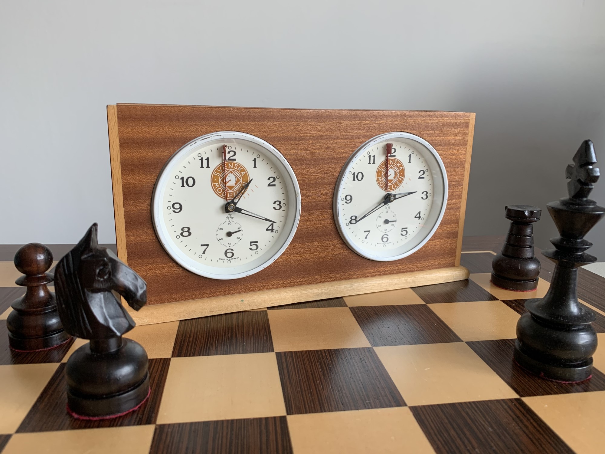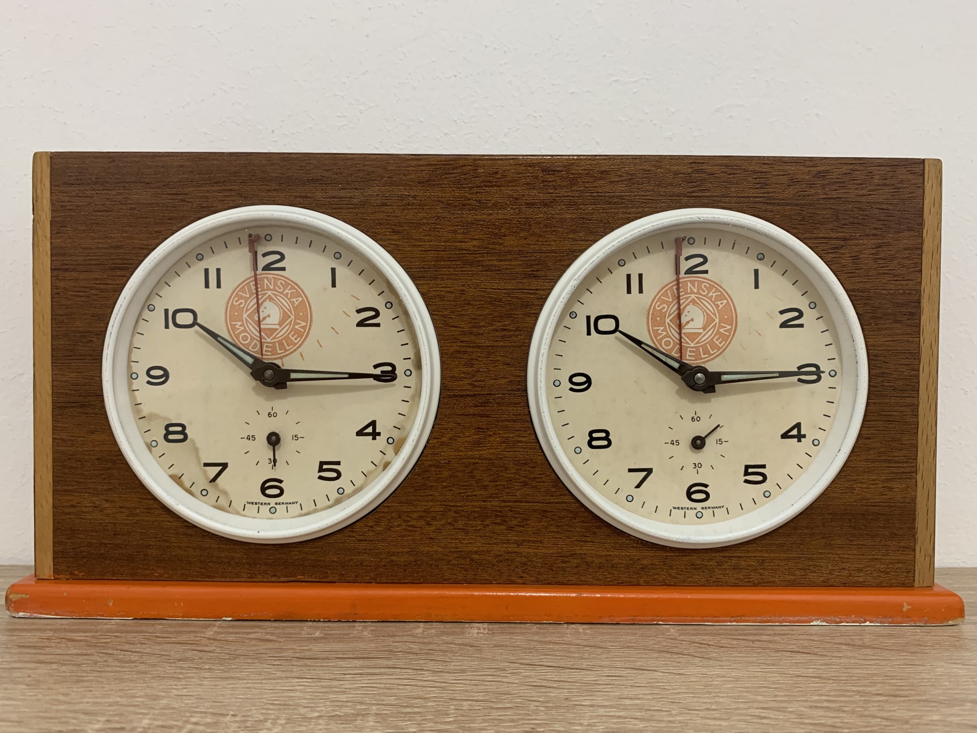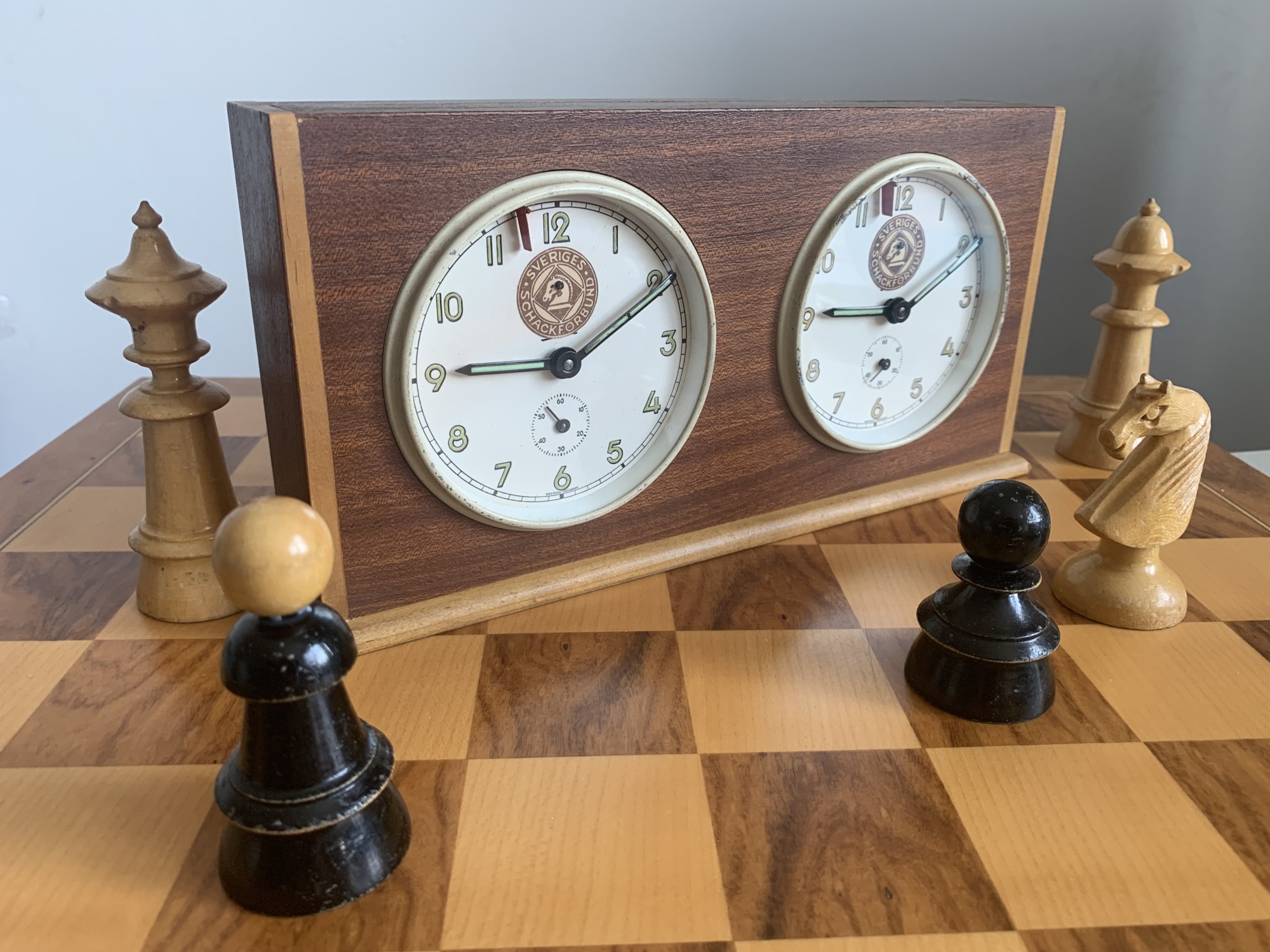 Classical 'Swedish Federation' chess clock. Both clock movements as well as faces are totally identical to the Koopmans from mid 1940th to the late 1950th. Surprisingly there are not a lot of photo evidences of the usage of this type of clock on tournaments (at least, in comparison to other Swedish); also, all the available photos refer to the second part of 1950th and 60th. Photo: Boerje Jansson (1972). |