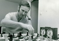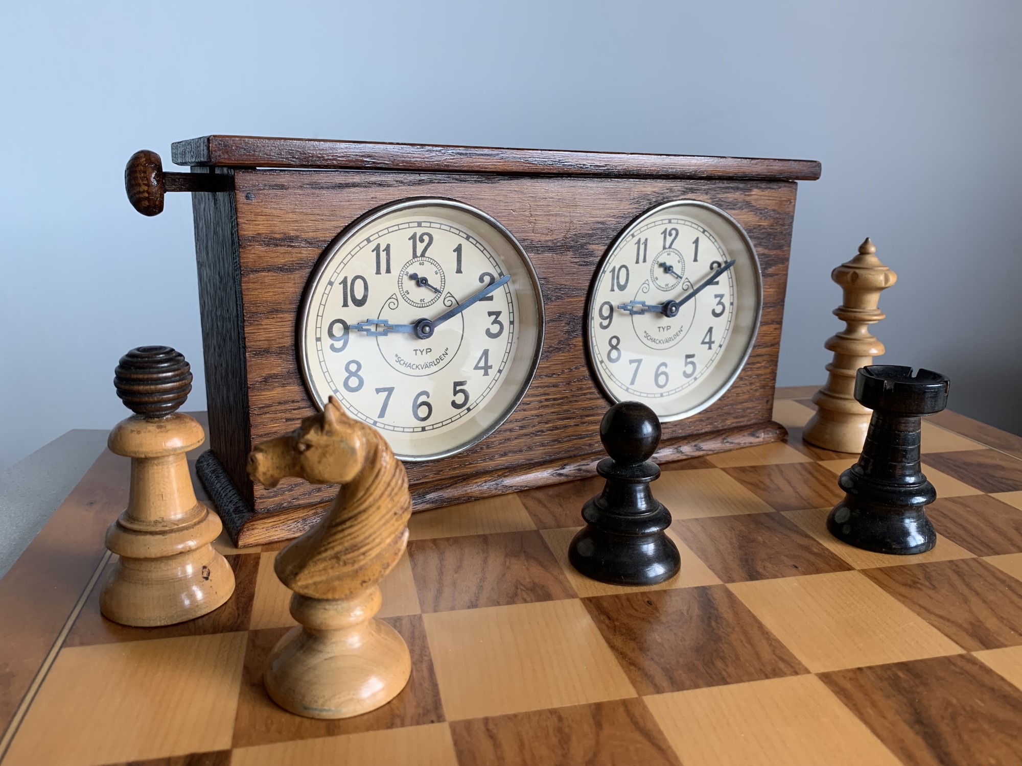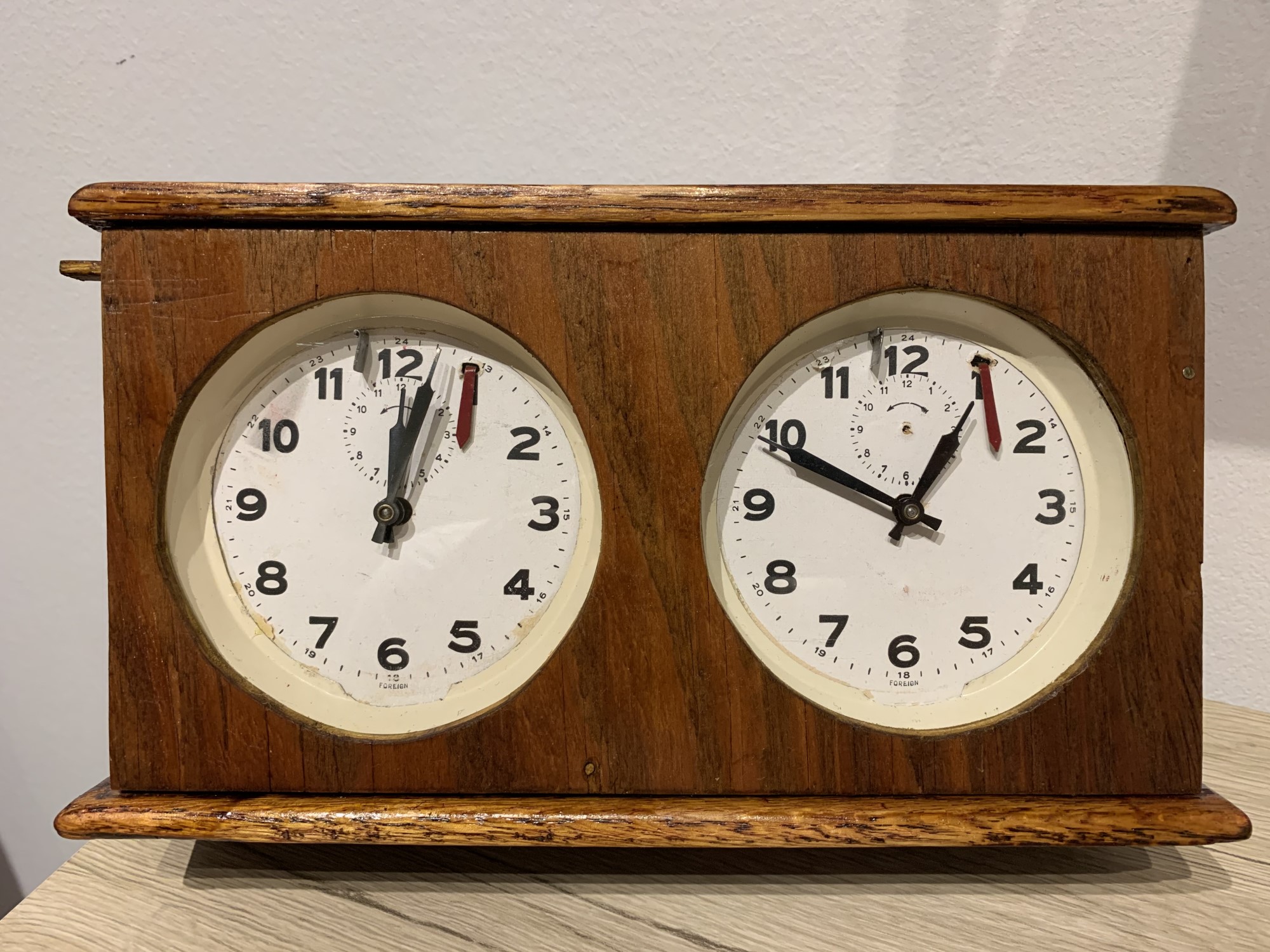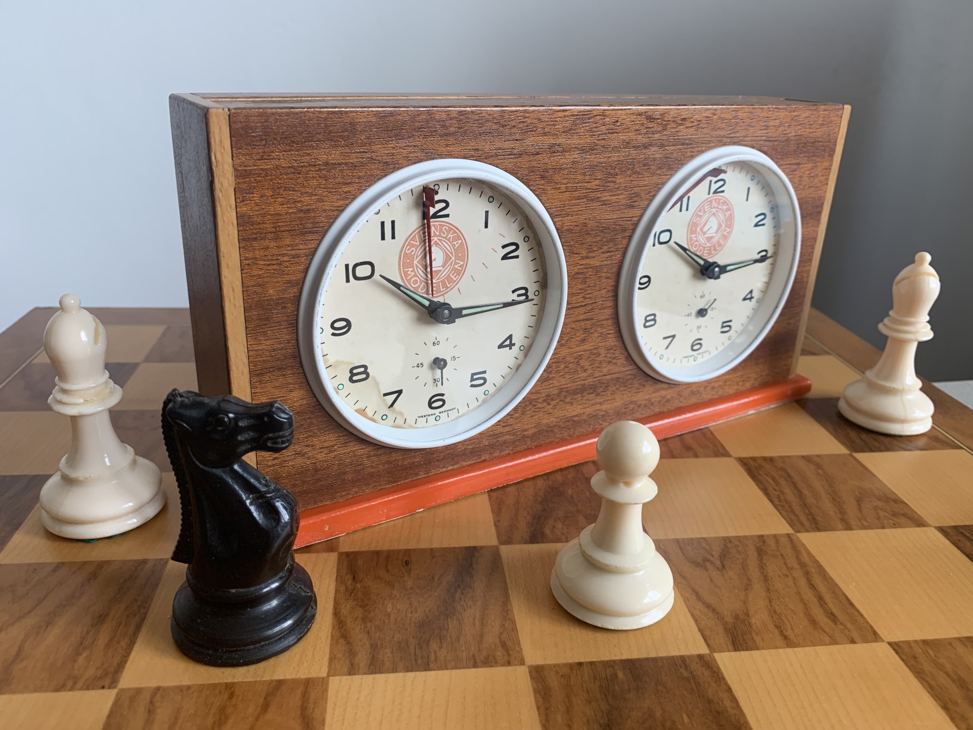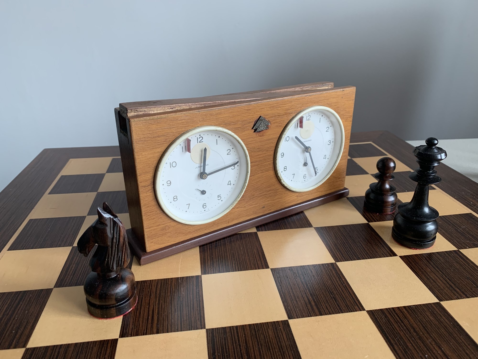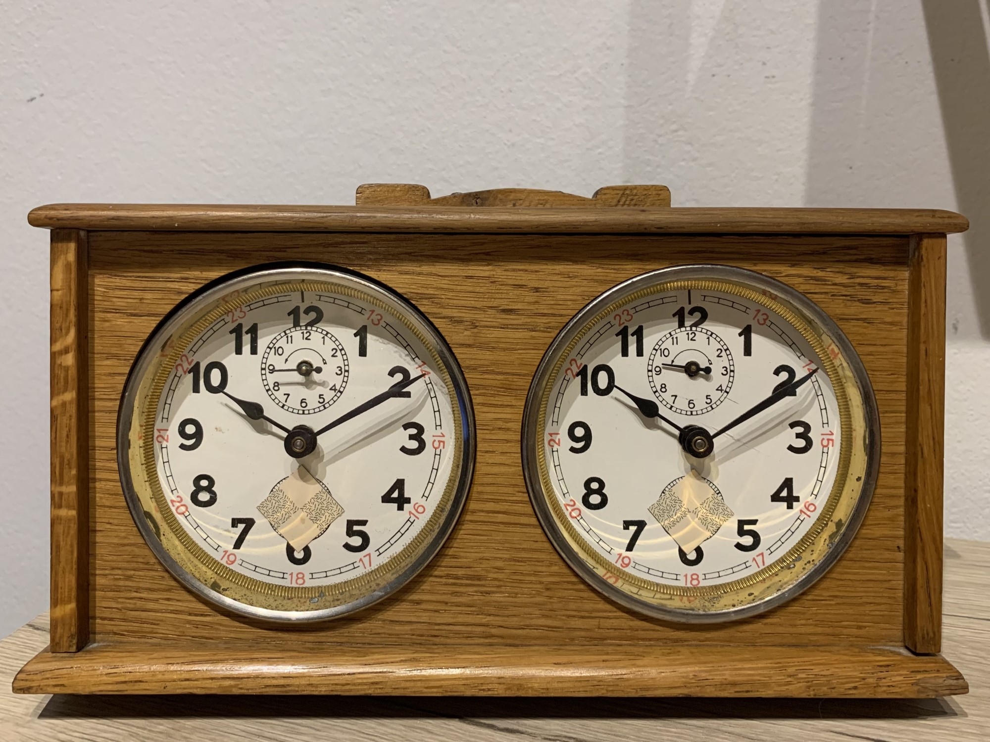 Classical 'Swedish Federation' chess clock. Both clock movements as well as faces are totally identical to the Koopmans from mid 1940th to the late 1950th. Surprisingly there are not a lot of photo evidences of the usage of this type of clock on tournaments (at least, in comparison to other Swedish); also, all the available photos refer to the second part of 1950th and 60th. Photo: Boerje Jansson (1972). |