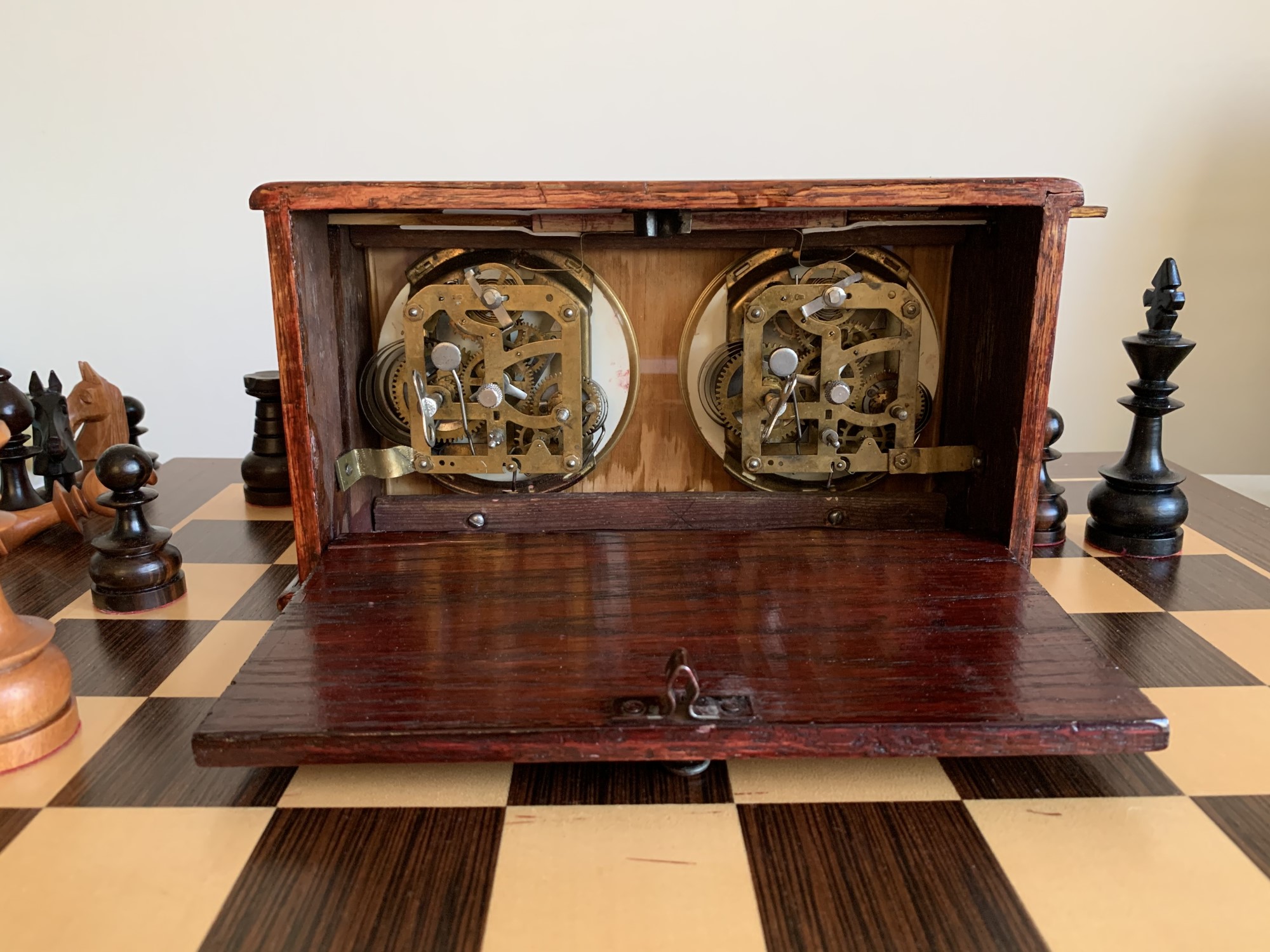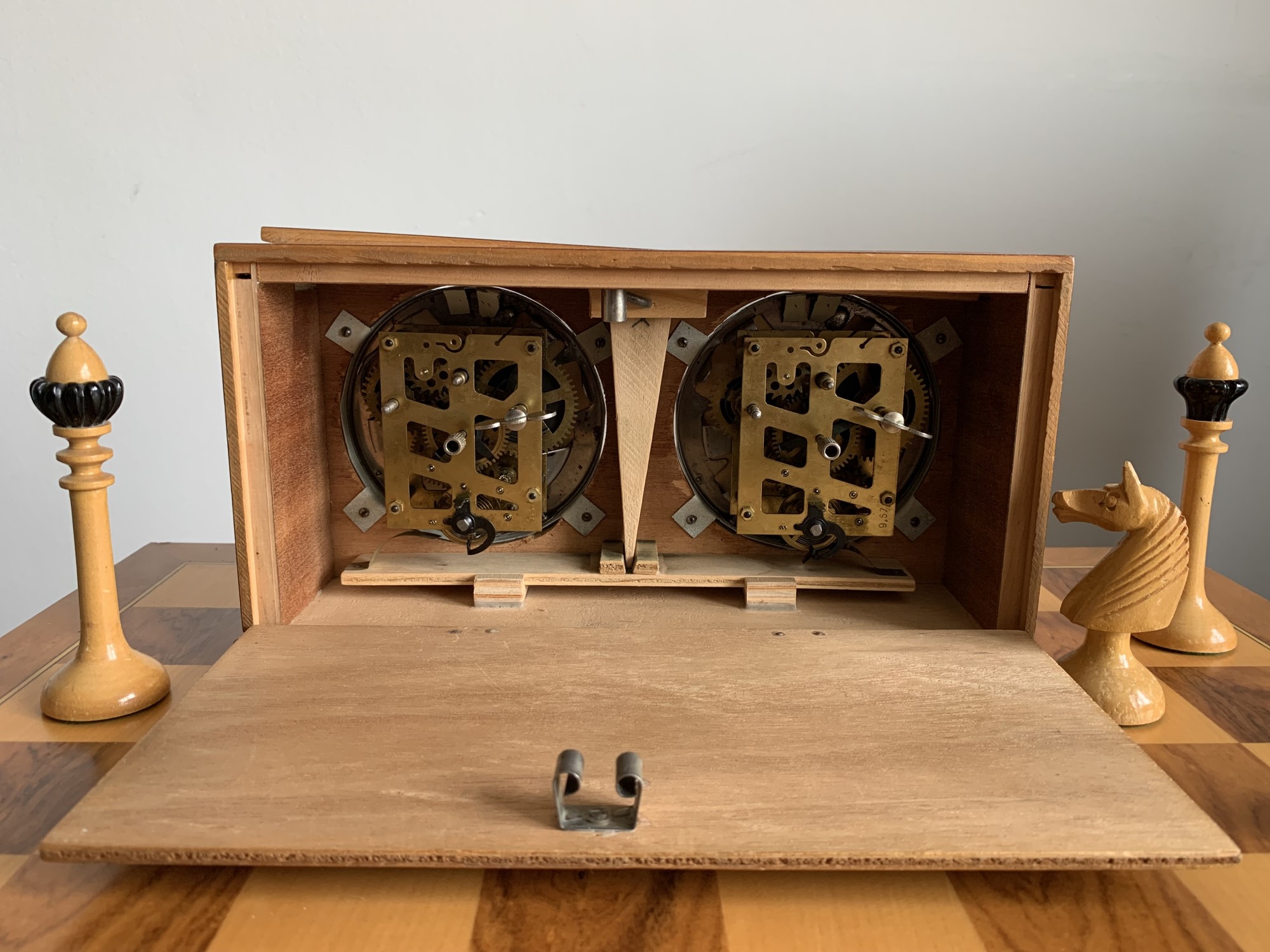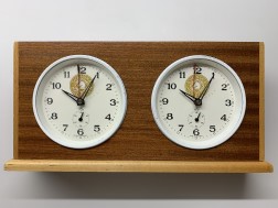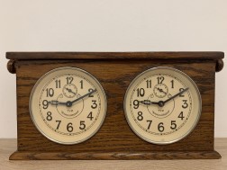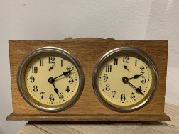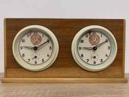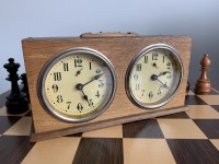 Quite a mysterious Swedish chess clock. Wooden pushbar case refers to 1920-30th. The movements with untypical second hands were taken from some alarm clocks, keeping an alarm function till now. Clock faces (marked 'foreign') originate from 1930th. It's not easy to identify / recognize properly the clock after numerous modifications and restorations, nevertheless, it remains a good example of Swedish history. |