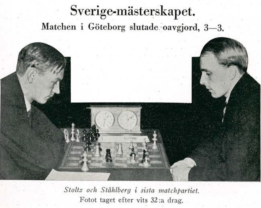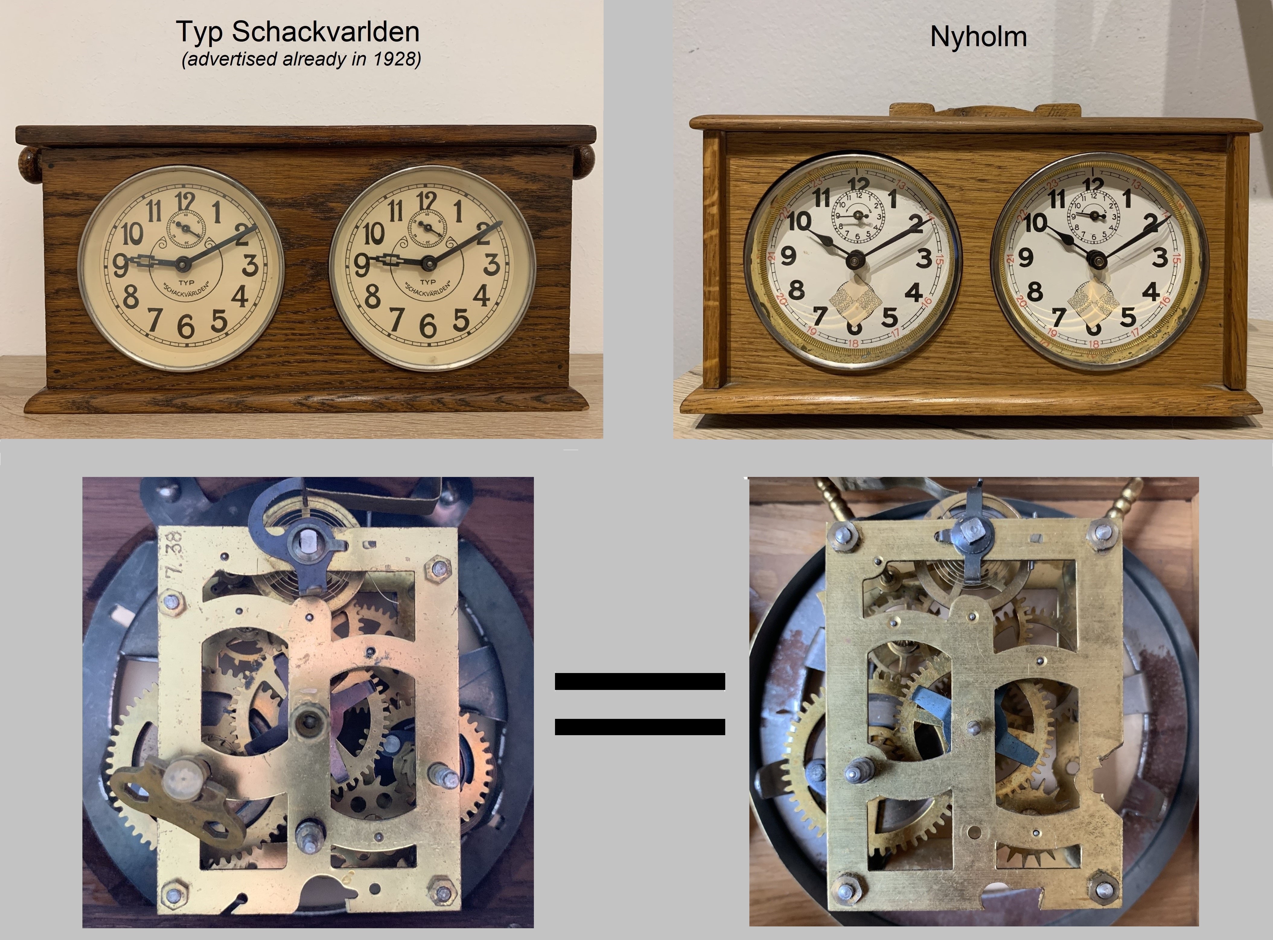 'Typ Schackvarlden' clock is associated with the Swedish player Karl Berndtsson (multiple champion of various tournaments), who started in 1923 his own chess magazine 'Schackvarlden' and advertised this model already in 1928. Karl passed away in 1943, 'Schackvarlden' magazine stopped at 1945, obviously the last clock has been produced around early 40th. As manufacture volumes were relatively low, clock did not appear often in the tournaments, nevertheless there are still evidences available, like in the game between Gosta Stoltz vs Gideon Stahlberg in the Swedish Championship (1931). |