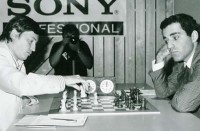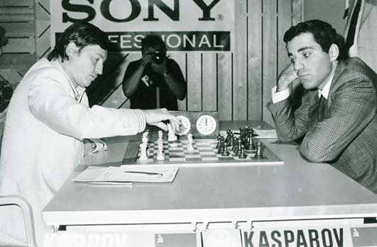 Another variation of the Tower clock, with 2 main differences: new generation of the Peter Uhren movements as well as different flags: made out of wire (not out of plastic like in previous version). Photo: A.Karpov vs. G. Kasparov in the Chess WorldCup (Skelleftea, 1989). |