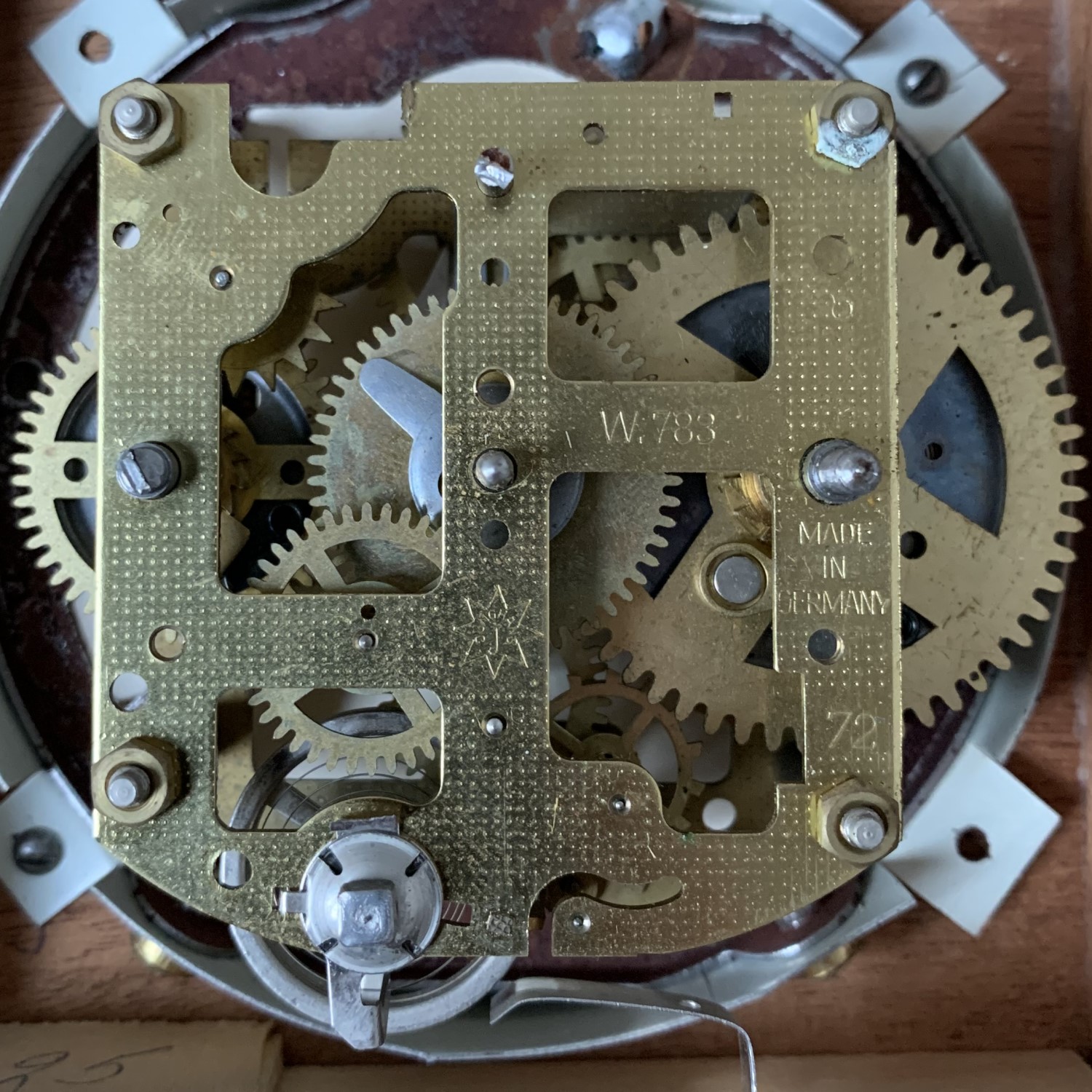 Traditional swedish pushbar chess clock called "Tower Clock" with the Jungahs W.783 movements. The W.783 movement is titled internally 'J250' with plates 57 x 52,5 mm. There are version with 200 beats and a 'Bivox' type with 150 beats per minute. This movement might appeared in the later 1930th and was built until 1970s. Number '72' may refer to the year of production 1972. Reference: an advertisement in the Swedish Chess Magasine (1973). |