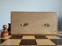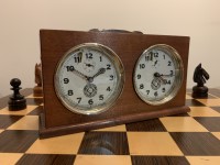 First generation of Swedish chess clocks: solid wooden case, classical shuttle slider and absence of flags. Its first advertisement appears in the Swedish Chess Magazine in 1925, presumably, these chess clocks were produced starting from early 1920th. Given model could be also recognized from the game between Gideon Stahlberg and Erik Lundin at the Swedish championships in Kalmar in 1938. |