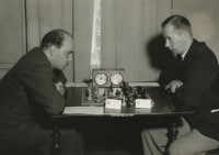 Swedish ‘Nyholm’ chess clock, named from the Swedish chess star Gustaf Nyholm. There is no reliable evidence when this model has been produced, however it already appears on photos in 1937 (Euwe vs. Stahlberg) and in 1939 (Lundin vs. Danielsson). Also Nyholm’s movements are equal to another Swedish model 'Typ Schackvarlden', known already from 1928. It might be reasonably concluded, that the clock is from mid-late 1930th. Nyholm has been widely used in pre-war Sweden, photo: occasional players on the chess tournament in Uppsala (1945). |